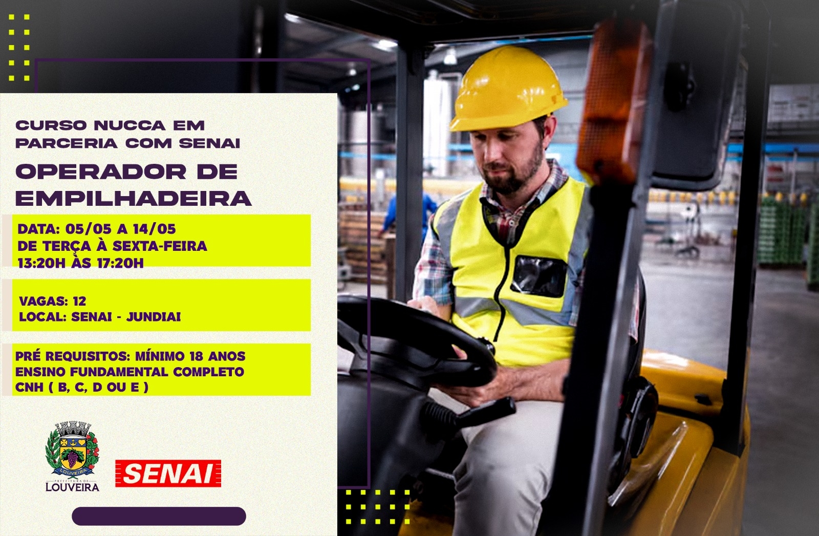 A Prefeitura de Louveira, em parceria com o SENAI, abriu hoje as inscrições para o curso de Operador de Empilhadeira. O curso será realizado de 5 a 14 de maio (terça a sexta), das 13h20 às 17h20, no SENAI de Jundiaí, e oferece 12 vagas. O objetivo é capacitar participantes para operar empilhadeiras seguindo normas técnicas e de segurança, saúde e meio ambiente (conforme informativo, página 1).