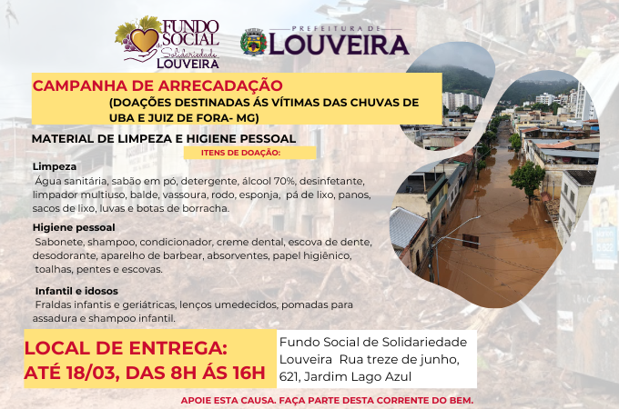 O Fundo Social de Solidariedade de Louveira, com apoio da Prefeitura de Louveira, iniciou uma campanha de arrecadação de doações para ajudar as famílias atingidas pelas fortes chuvas nas cidades de Ubá e Juiz de Fora, em Minas Gerais.