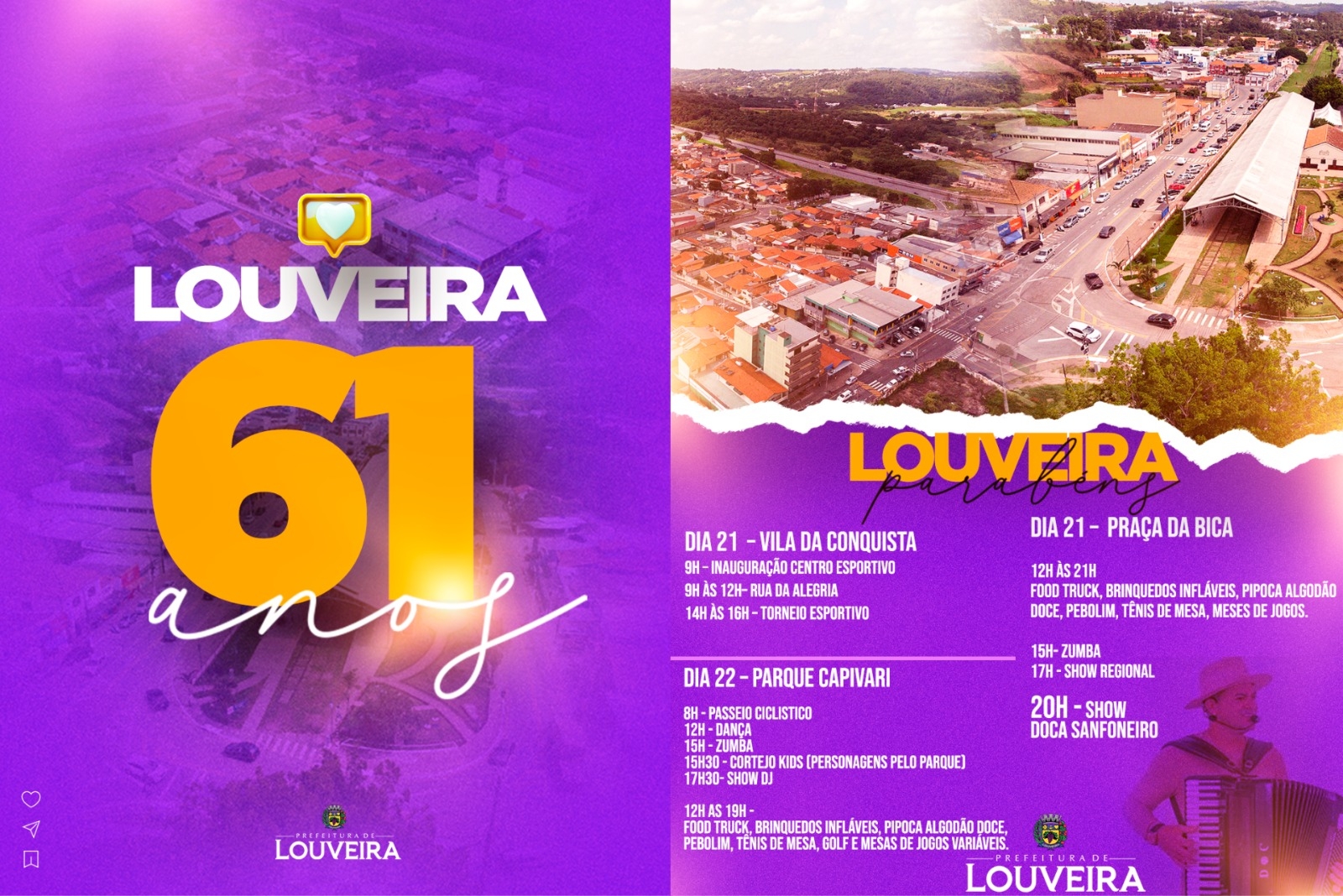 A Prefeitura de Louveira preparou uma programação especial para comemorar os 61 anos de emancipação do município, celebrados no próximo final de semana, com atividades gratuitas para toda a população. A agenda inclui inauguração de espaço esportivo, apresentações culturais, atividades esportivas, brinquedos para crianças, praça de alimentação e shows musicais.