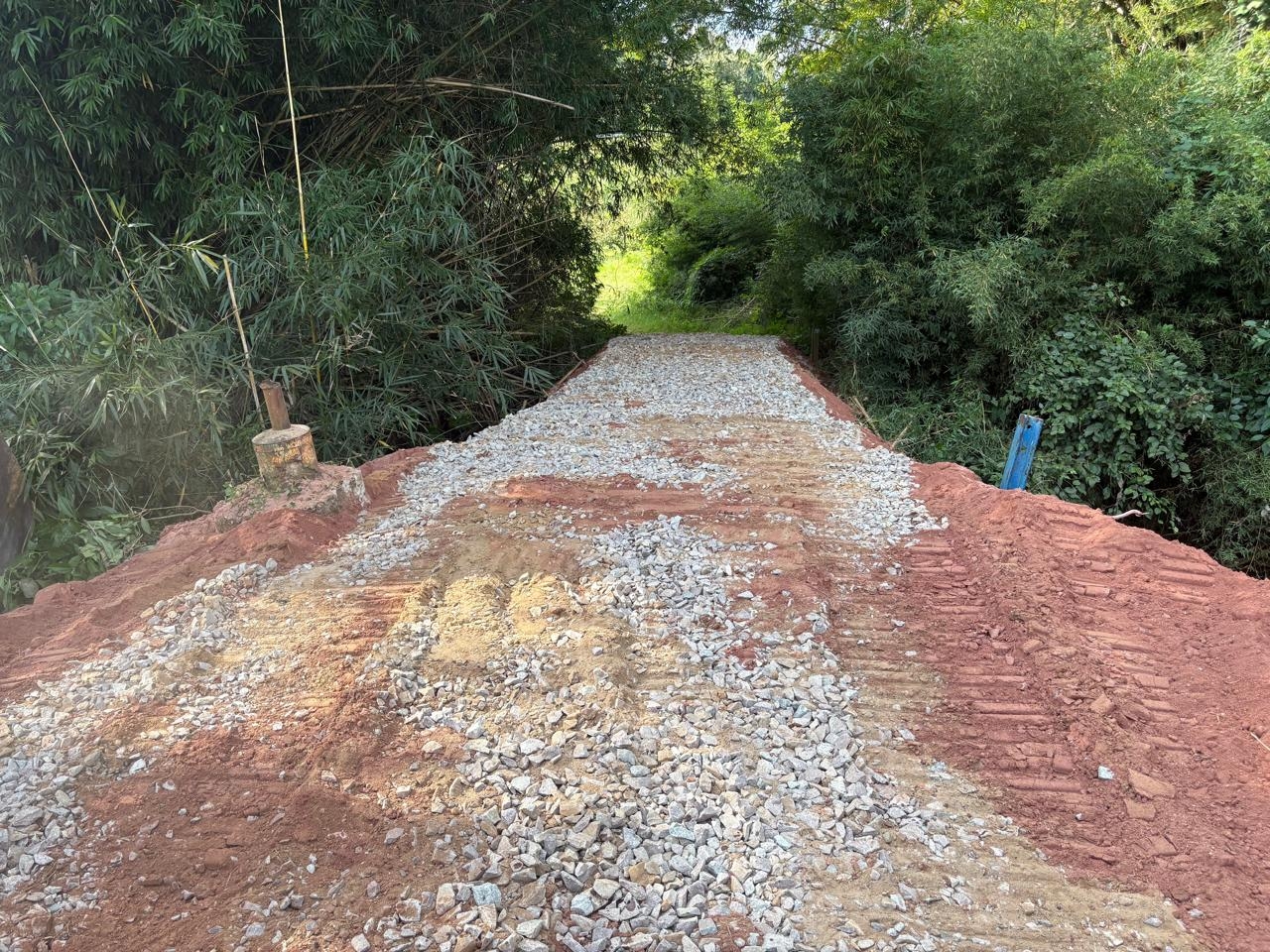 Para garantir mais segurança e restabelecer o tráfego, a equipe executou a recomposição do tabuleiro da ponte, utilizando brita como base para oferecer maior estabilidade à estrutura.